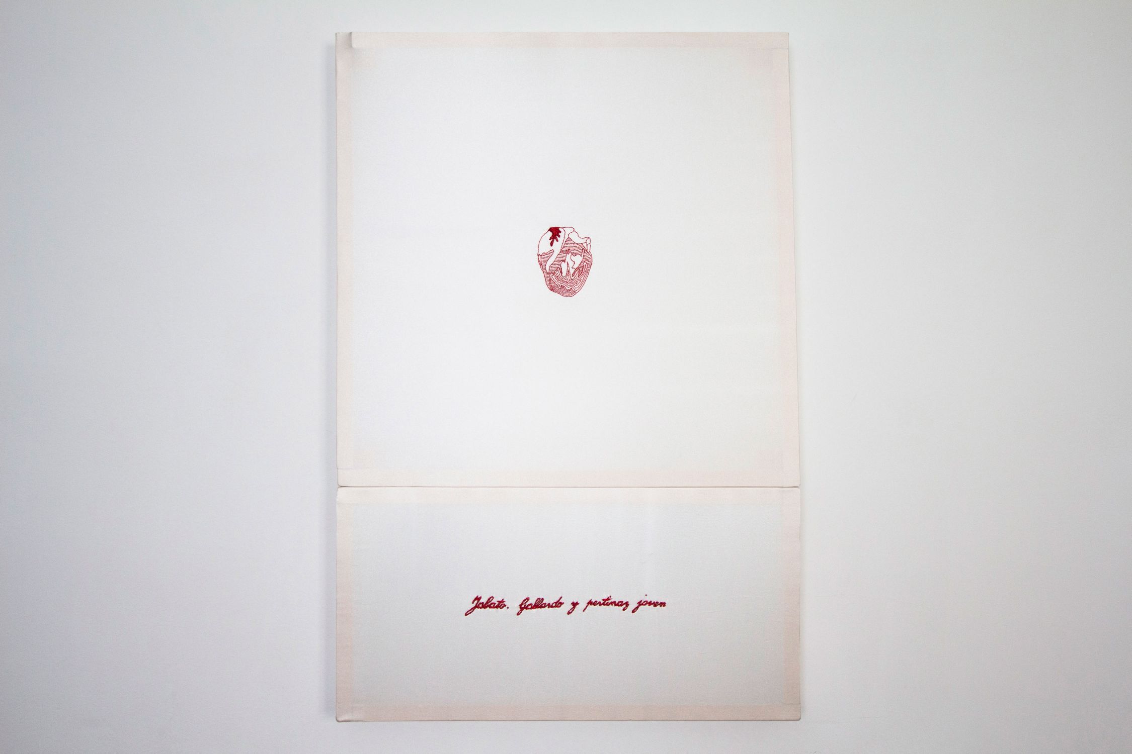 Reg. 89 Garazzi Lara Icaza Coracoes das bestas. Bordado rojo metalizado sobre satén blanco, serie de 9 dípticos de 50 x 50 cm y de 30 x 50 cm.