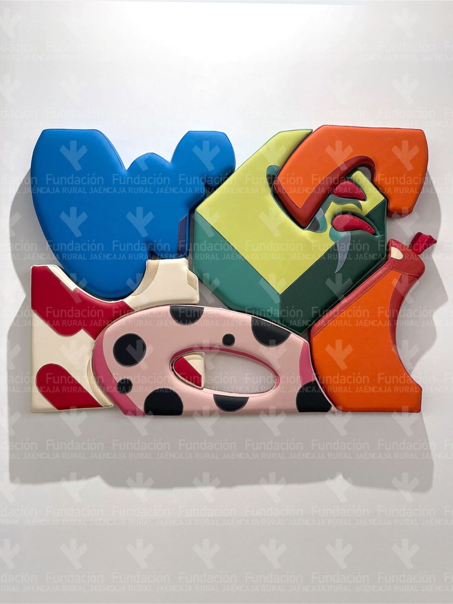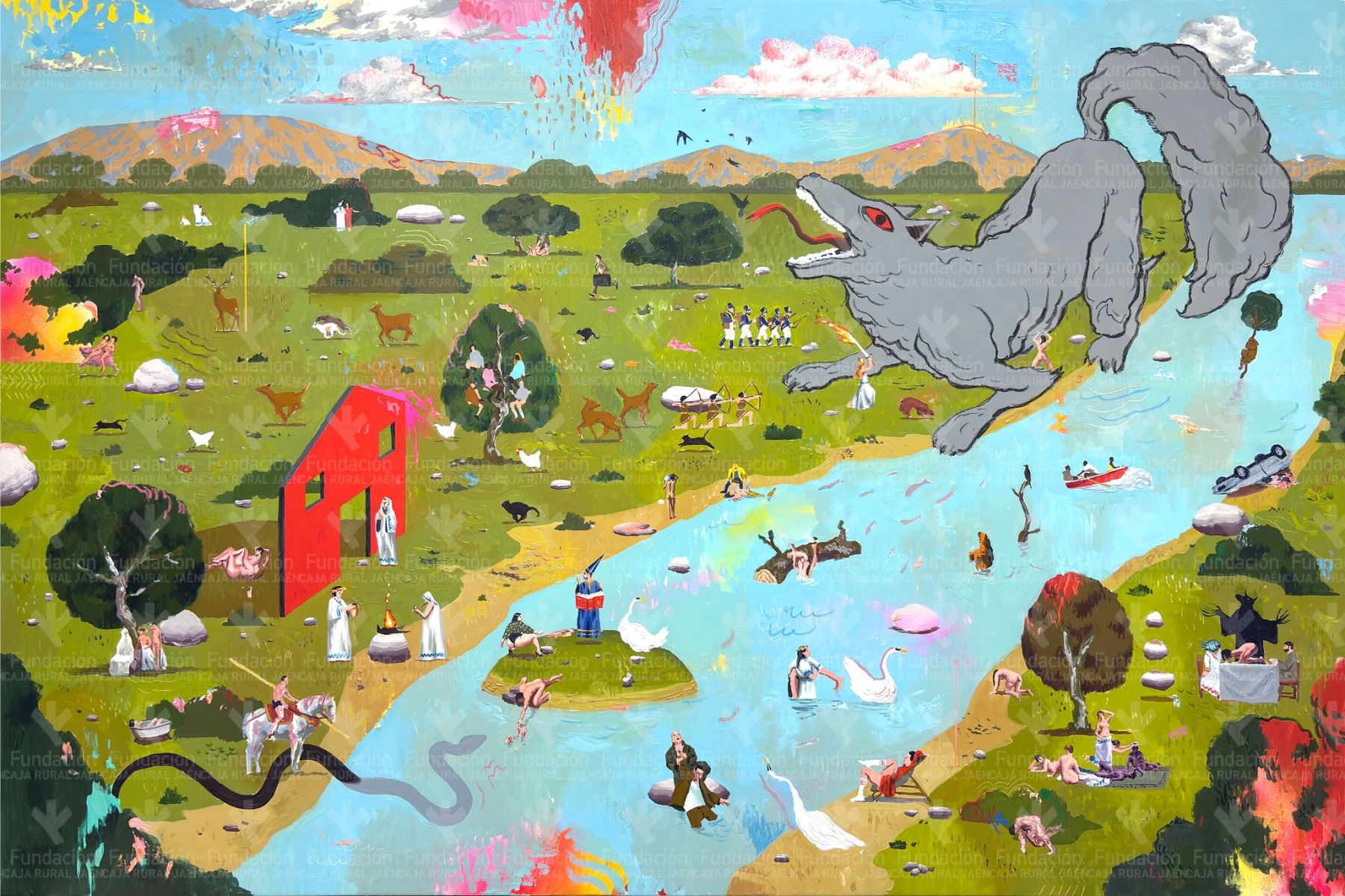 - Acrílico, acuarela, collage, rotuladores, grafito, lápiz de color y spray sobre papel, 130x155x1 cm